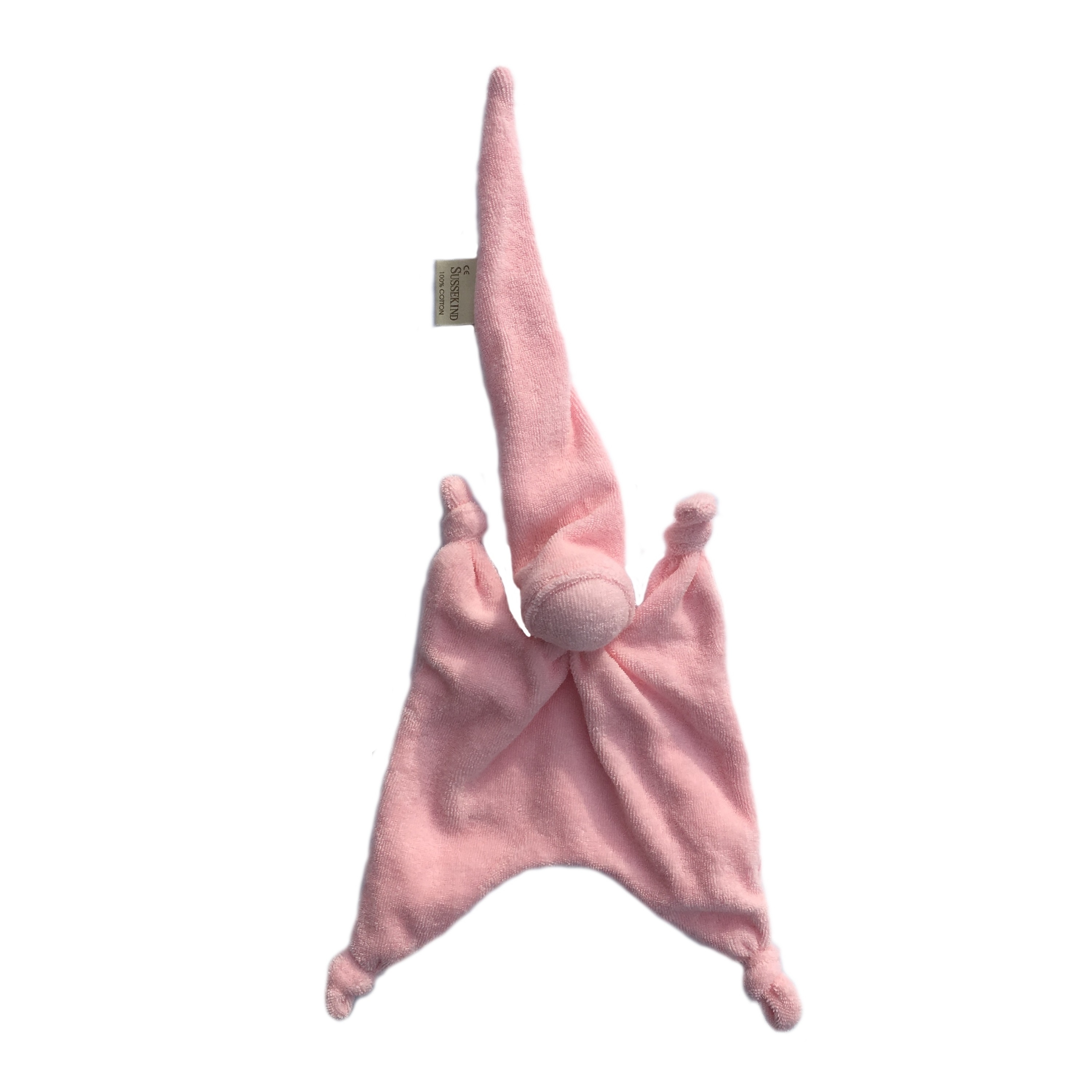 Knuffelpopje van katoenen zachte badstof pastel roze Model: Knoopie Materiaal:katoenen tricot badstof pastel roze Afmeting zonder muts: 1...